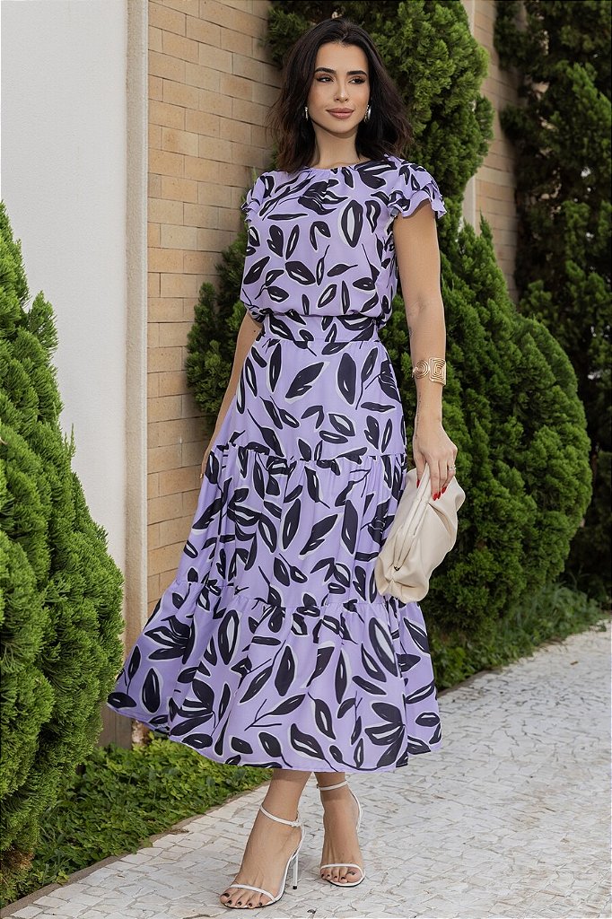 Estampa: A estampa Lilac Garden apresenta um design elegante e moderno, com folhas estilizadas em preto sobre um fundo lilás claro. As folhas criam um padrão sofisticado, com um contraste marcante entre as cores. Ideal para looks que transmitem estilo e leveza.